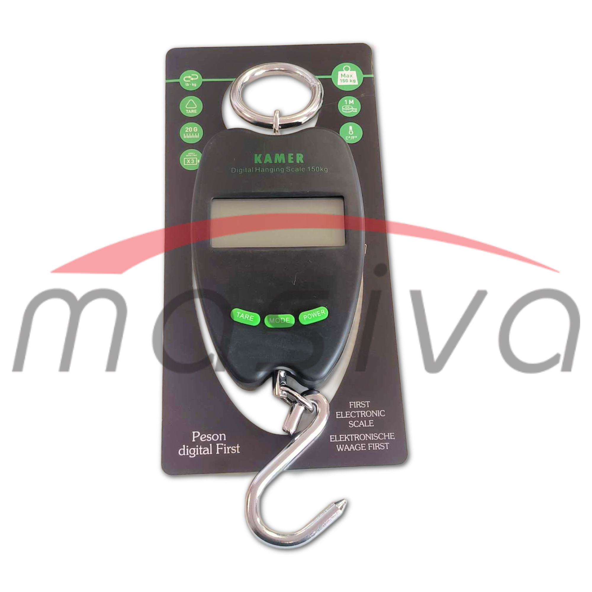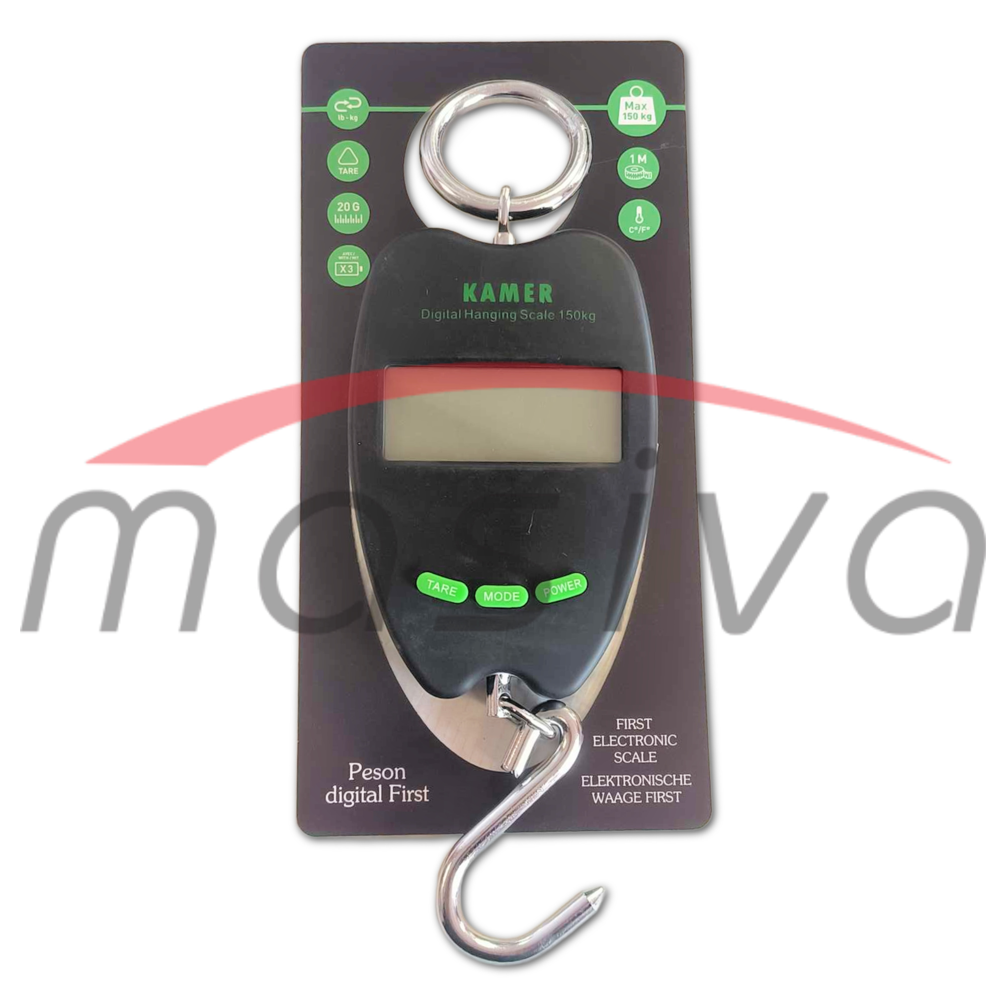 Viseća digitalna vaga KAMER – 150 kg radi na baterije te ima mogućnost izbora jedinice vaganja (kg, lb).